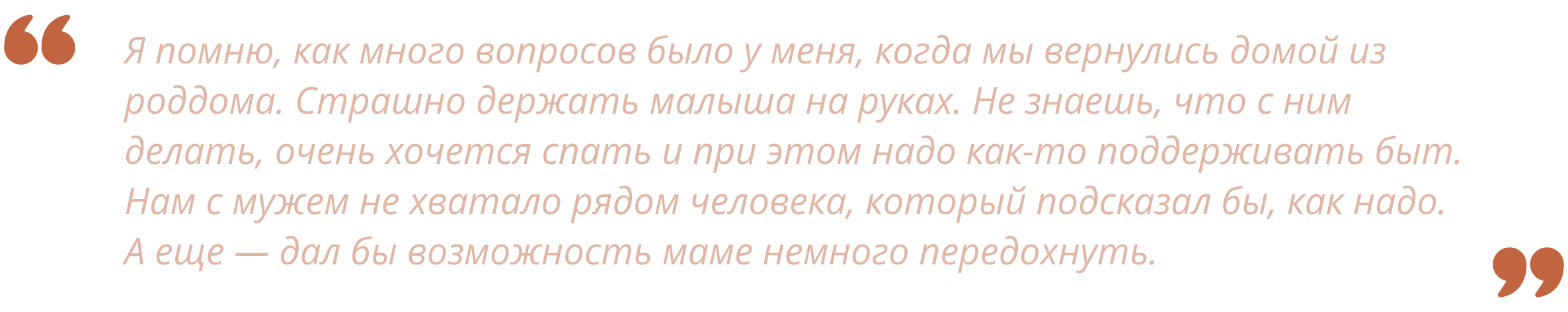 Я помню, как много вопросов было у меня, когда мы вернулись домой из роддома. Страшно держать малыша на руках. Не знаешь, что с ним делать, очень хочется спать и при этом надо как-то поддерживать быт. Нам с мужем не хватало рядом человека, который подсказал бы, как надо. А еще — дал бы возможность маме немного передохнуть.