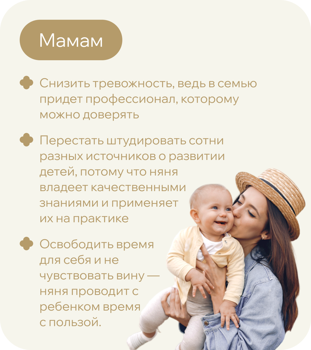 У нас есть корпоративный психолог, который заботится о ментальном здоровье, чтобы няня не выгорала и была в ресурсе