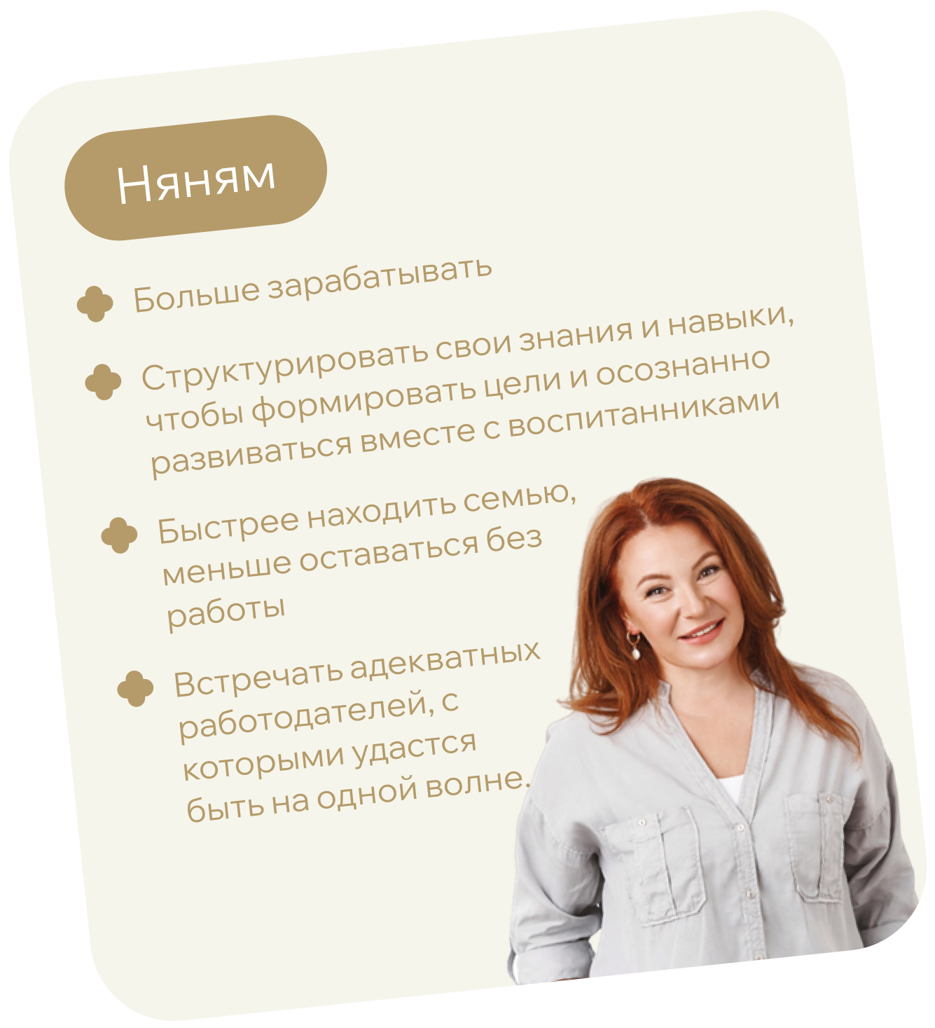 Все наши сотрудники — лучшие выпускники Высшей Школы Нянь по результатам внутренних экзаменов. Мы точно знаем, что это профессионалы своего дела.